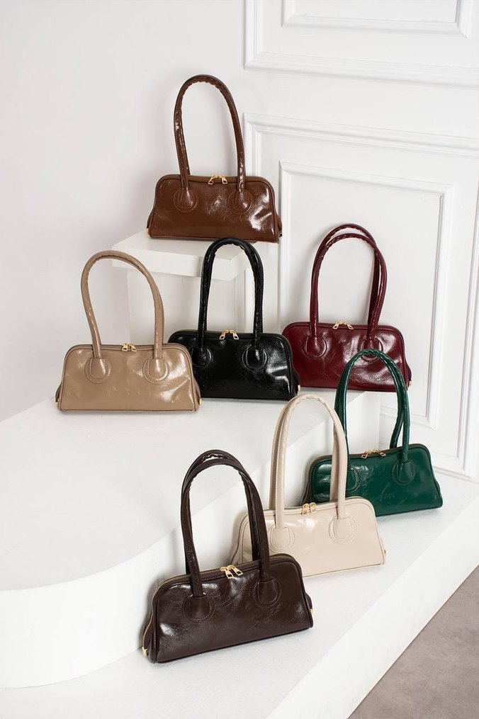 Parlak deri yüzeye sahip modern klasik kadın el çantası, koyu kahverengi renkte. Desensiz şık tasarımı günlük kullanım için Paris tarzı zarafet sunar.