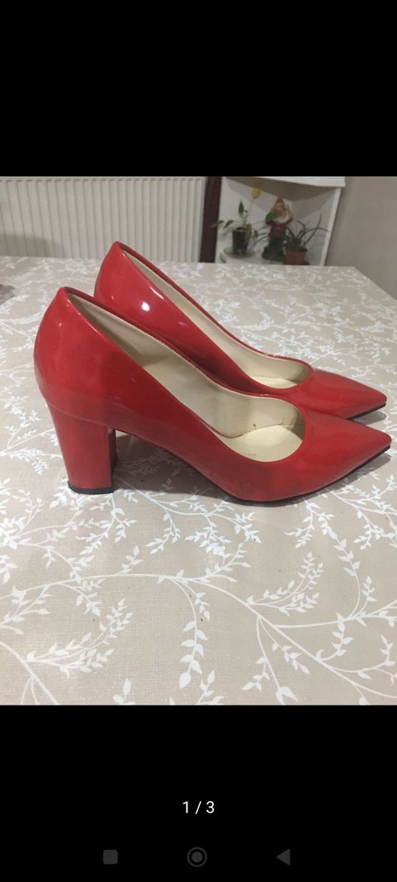 Parlak kırmızı renkte, lastik malzemeden yapılmış blok topuklu kadın stiletto. Modern klasik tasarıma sahip, ofis için uygun ve desensiz. Çok az giyildi
