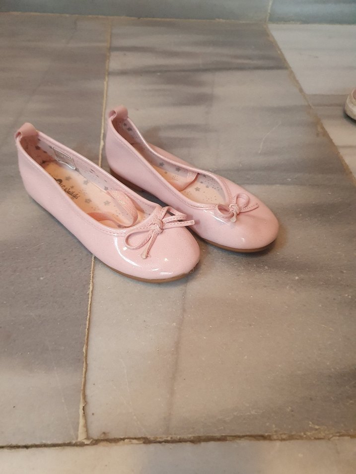 Pastel pembe renkte, lastik malzemeden yapılmış kız çocuk babetleri, küçük fiyonk detayına sahip sade ve klasik bir tasarım sunar.