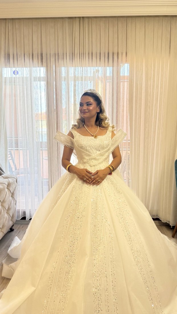 Bu beyaz prenses gelinlik, kalın askılı ve yan kol detay tasarıma sahiptir. Gevşek kesimi ve uzun boyu ile klasik zarafeti yansıtır. Beden olarak 36-40 arası olur arkası bağlanır ben çok memnun kaldım temiz kuru temizlemeye vermedim alan kişi verebilir güvenemediğim kimseye normal yerde sürünen kısmı toz kapıyor onun haricinde kusursuz. Gelin Tacımıda hediye olarak göndericem :))