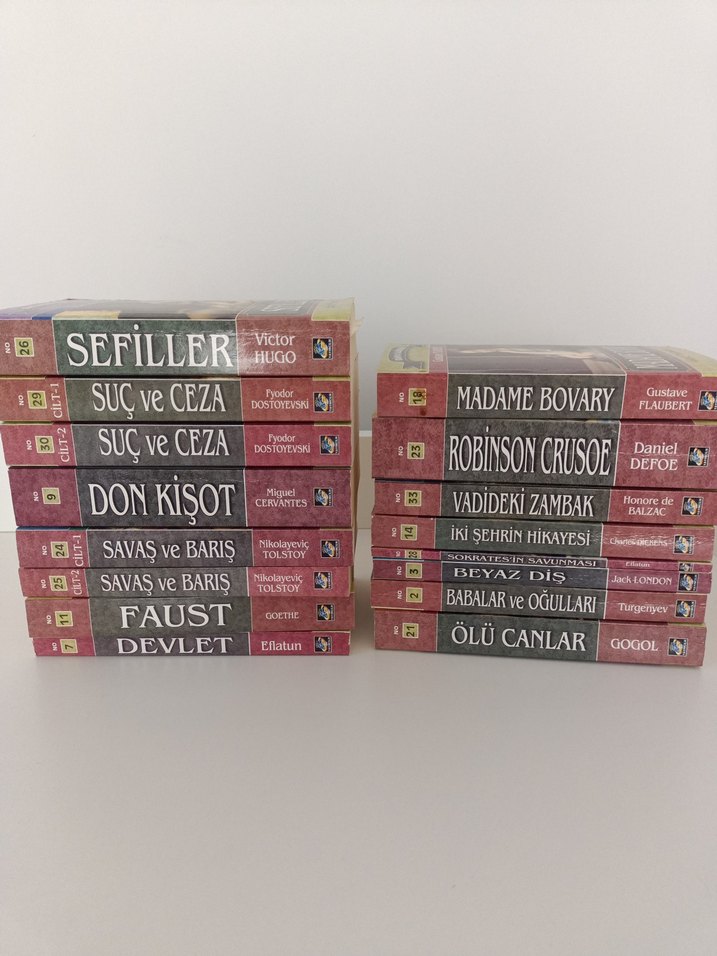 Faust, Sefiller, Suç ve Ceza, Don Kişot ve Madame Bovary gibi 16 klasik roman içeren set. tane fiyatıdır.