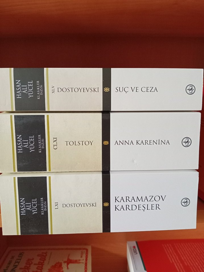 Dostoyevski ve Tolstoy'un "Suç ve Ceza," "Anna Karenina" ve "Karamazov Kardeşler" romanlarını içeren klasik eser seti.