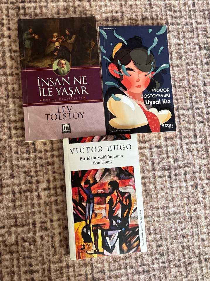 Lev Tolstoy, Fyodor Dostoyevski ve Victor Hugo'nun klasik romanlarından oluşan set. Kitaplar: İnsan Ne İle Yaşar, Uysal Kız, Bir İdam Mahkûmunun Son Günü.