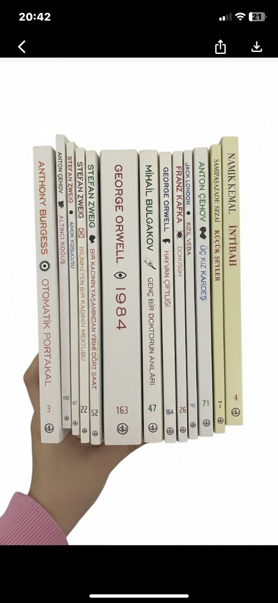 George Orwell, Franz Kafka, Stefan Zweig gibi yazarların 1984, Hayvan Çiftliği gibi klasik romanlarından oluşan 12 kitaplık set. TANESİ 30 lira