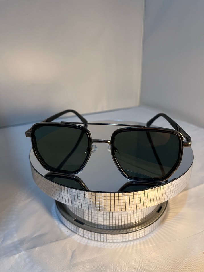 Klasik, çağdaş tasarıma sahip şeffaf ve siyah çerçeveli güneş gözlüğü, koyu ve zarif bir görünüm sunar. ️