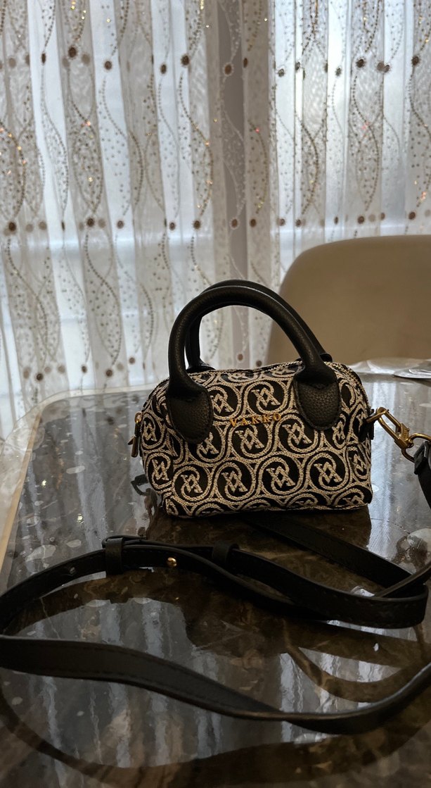 Sentetik kumaştan yapılmış, desenli ve tokalı siyah kadın çantası. Klasik şıklığı yansıtan sokak tarzında, günlük kullanım için uygun.