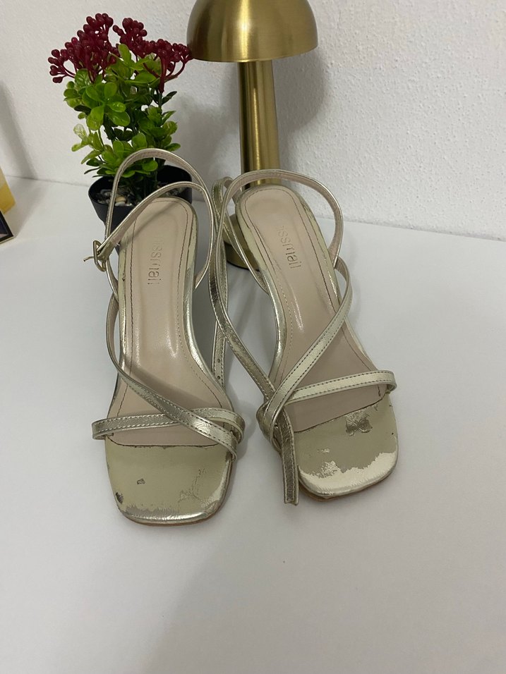 Altın renkli, tokalı bantlara sahip topuklu ayakkabılar. Düğünler için zarif modern klasik tasarım.