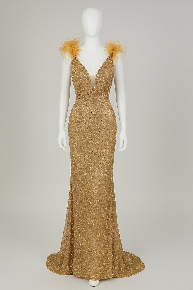 Klasik Şıklık Altın Renkli Uzun Abiye Elbise