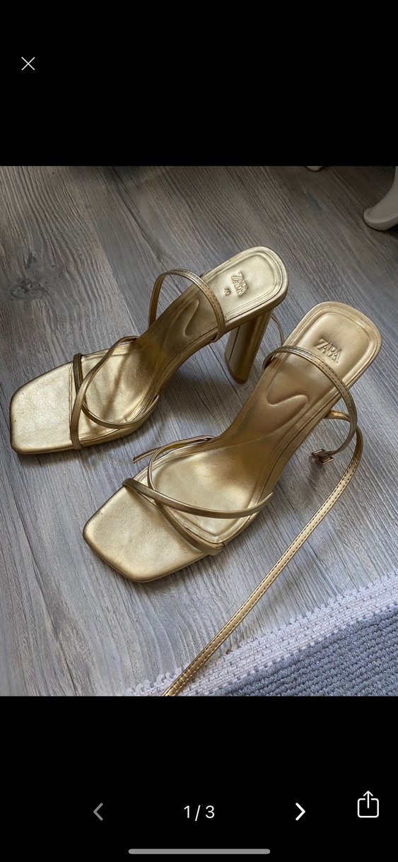Parlak altın renkte, yılan desenli, ipeksi dokulu stiletto topuklu sandaletler. Tokalı ince bantları ile romantik akşamlar için ideal. ✨ 40 numara 1 kere mezuniyetimde giymistim