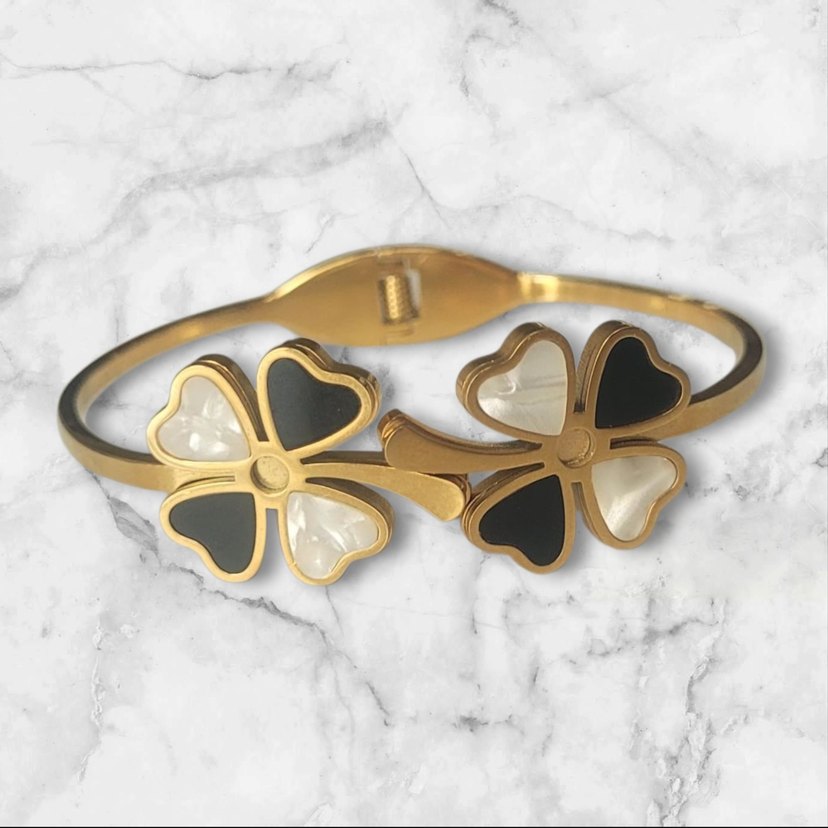 Klasik şıklığı yansıtan altın renkli, tokalı ve koyu renkli çiçek desenli yonca bileklik, günlük kullanım için uygundur. Paslanmaz 316L Çeliktir.