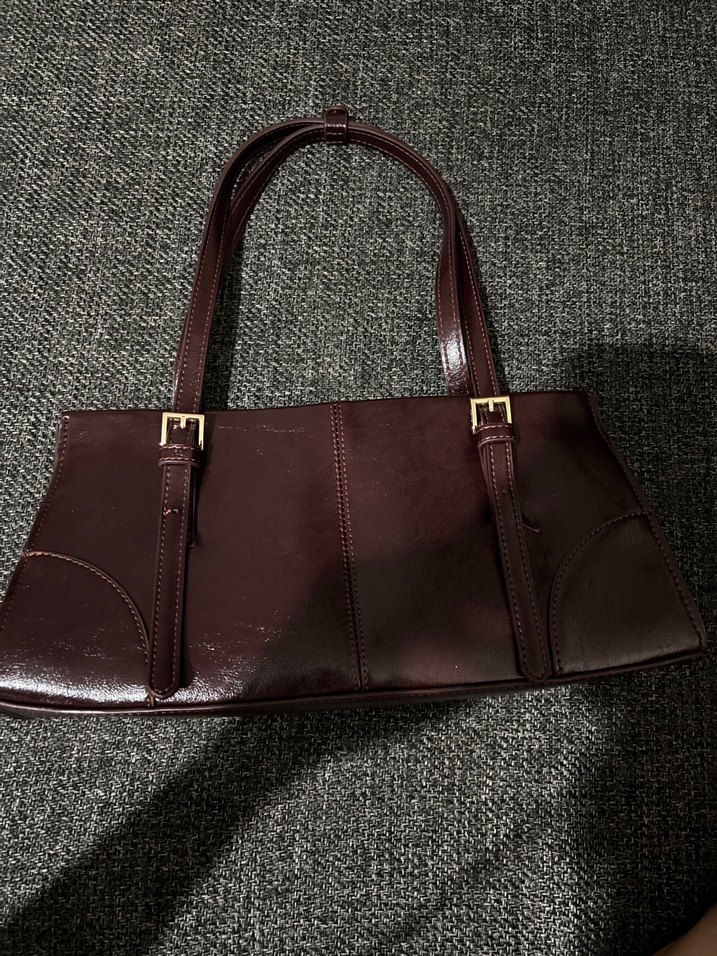 bordo deri, tokalı askılı kadın çantası, parlak yüzeye ve modern klasik stile sahiptir. Günlük kullanıma uygundur.