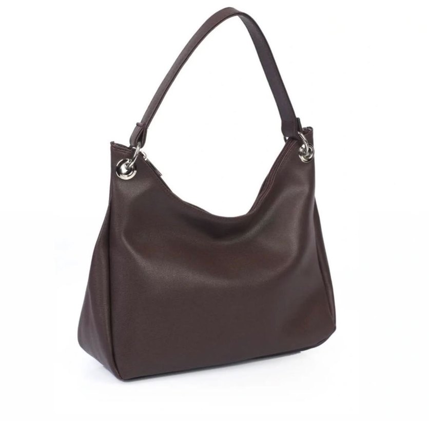 Koyu kahverengi deri kadın çanta, minimal tasarım, tokalı detay ve çağdaş stil ile günlük kullanıma uygundur.