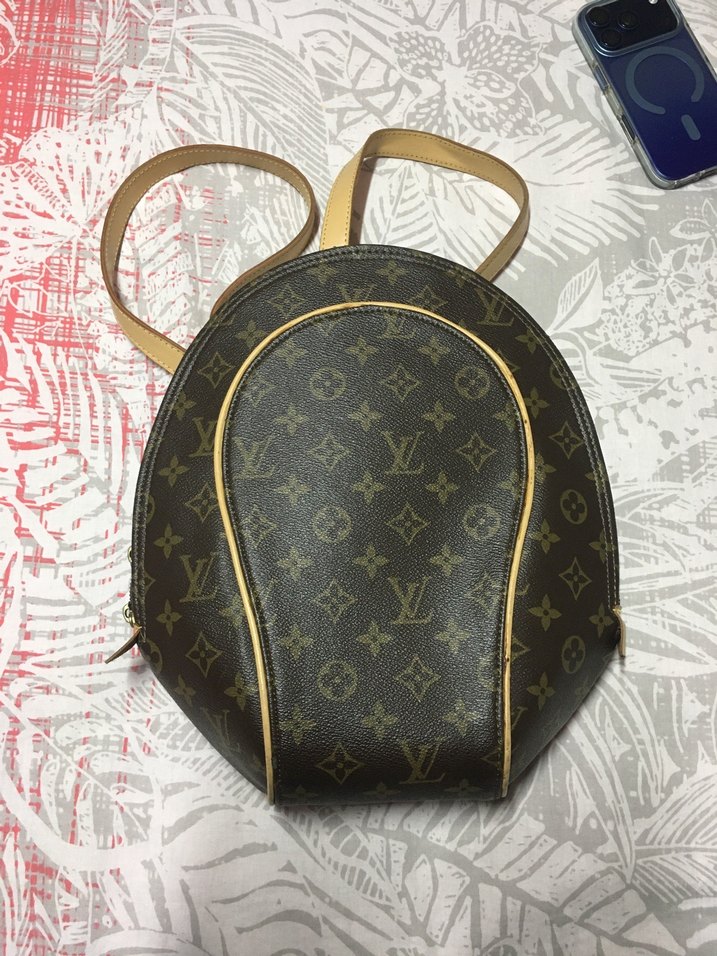 Parlak kahverengi deri sırt çantası, baskılı desen ve tokalı kayışlarla klasik şıklık ve karşı kültür stilini günlük kullanıma sunar.