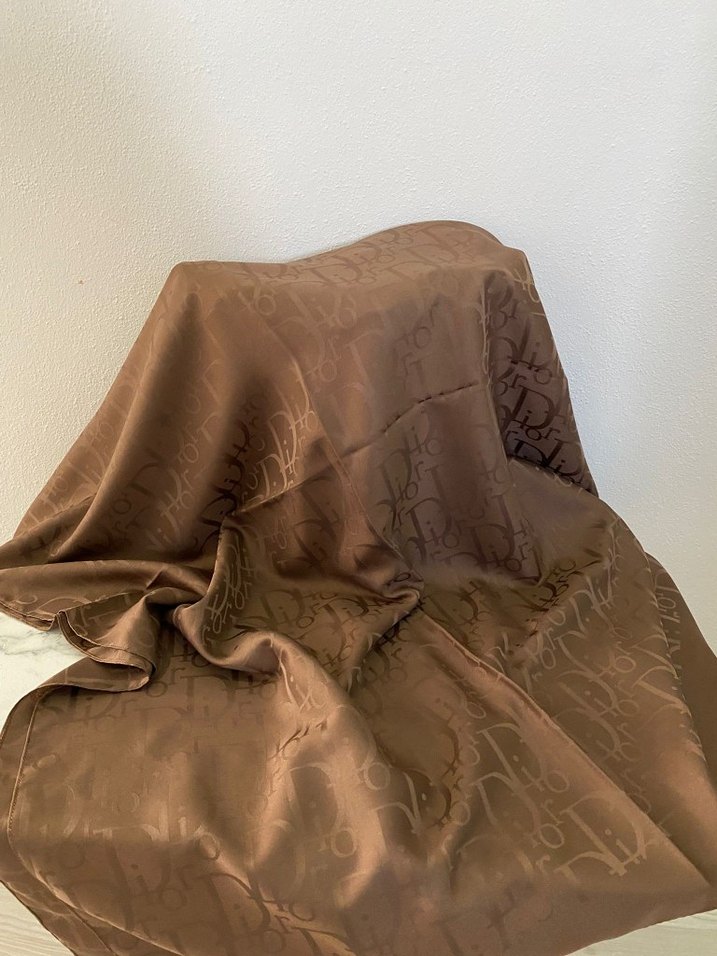 Koyu kahverengi, ipek görünümlü kumaştan, drapeli tasarıma sahip kadın şalı. Rahat ve çağdaş klasik şıklık sunar.