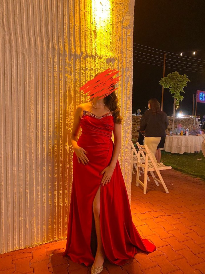 Drapeli, straplez ve uzun kırmızı abiye elbise. Şık, parlak ve desen içermeyen kumaşıyla düğünlere uygundur.