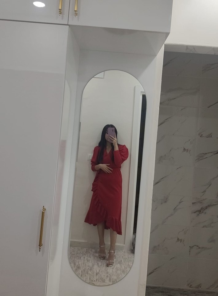 Kırmızı, uzun ve drapeli tasarıma sahip, v yakalı, ince kesim elbise. İpeksi kumaştan, uzun kollu ve parlak yüzeye sahip, minimalist