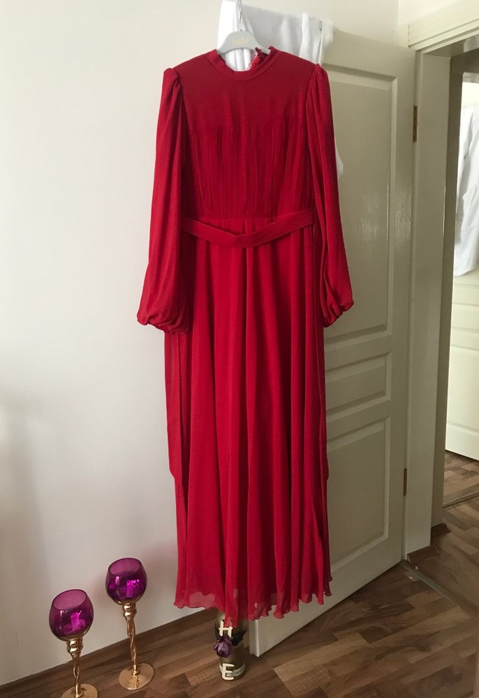 Kırmızı, uzun ve ipeksi kumaştan yapılmış, drapeli, yüksek yakalı ve uzun kollu elbise. Bol kesimi ve parlak görünümüyle düğünler için uygundur. Özel dikim