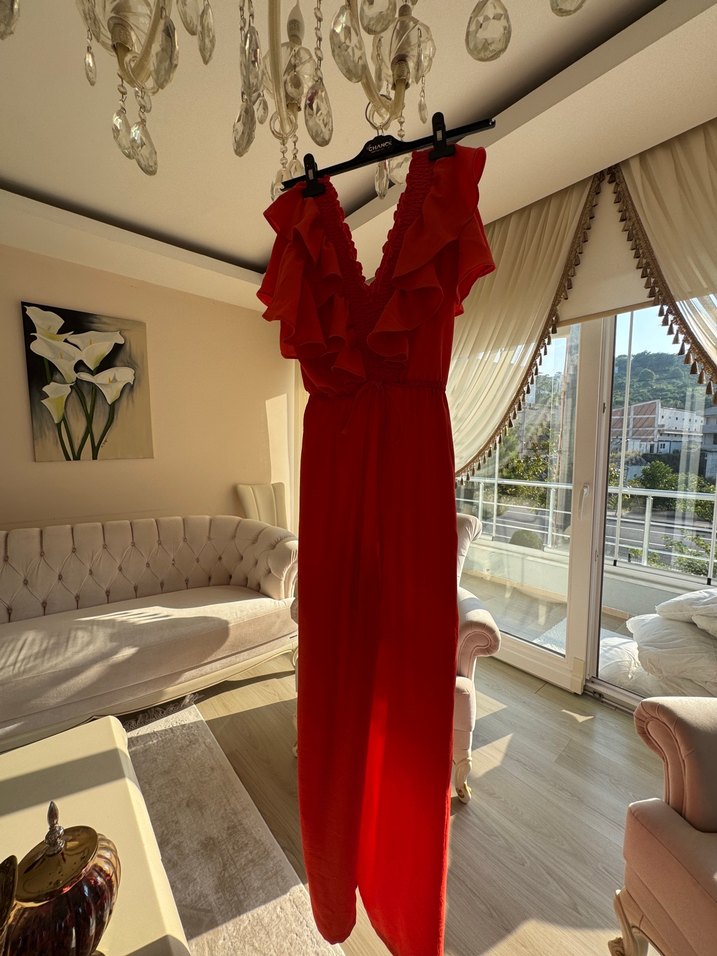 Turuncu renk tulum V yaka ve kolsuz tasarıma sahip. Fırfır detayları ve ipeksi kumaşıyla Paris tarzı modern klasik, rahat kesimdir.