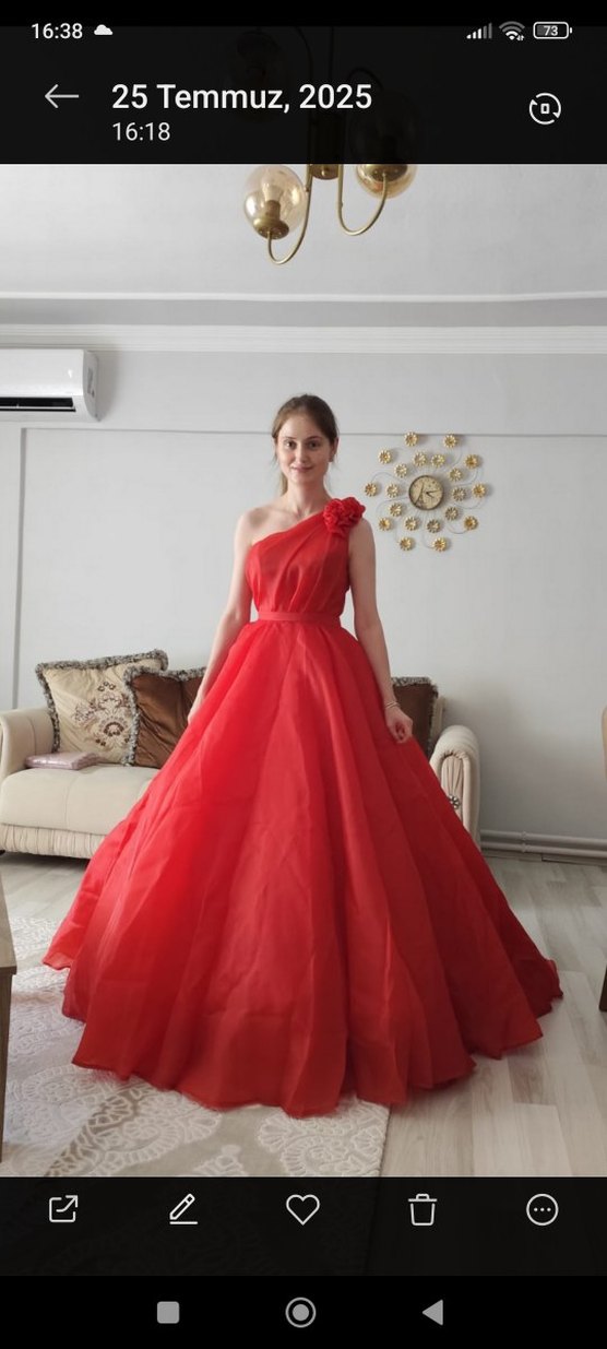 Kırmızı, tek omuzlu uzun abiye, drapeli ve bol kesimiyle modern klasik şıklığı yansıtıyor. Parlak desenli kumaştan, düğün için uygun. 14 Ağustostan sonra satılıktır. Kınam için aldim. özel dikim.