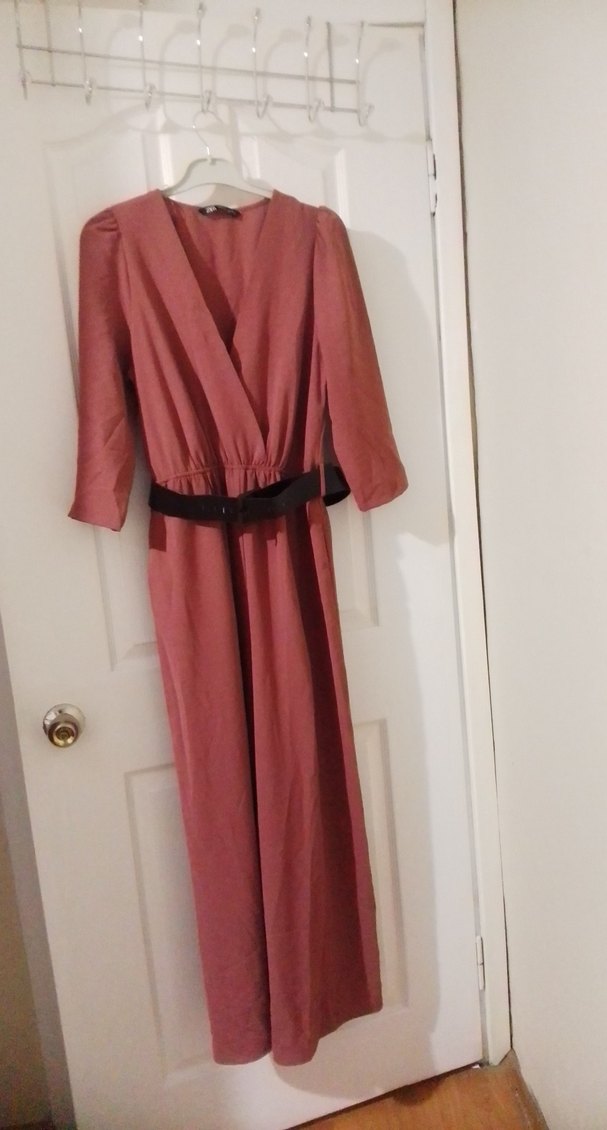 Koyu pembe renkte, yakası kesik ve kemerli uzun elbise. İpek gibi kumaştan, salaş kesim, günlük sokak stili için minimal tasarım.