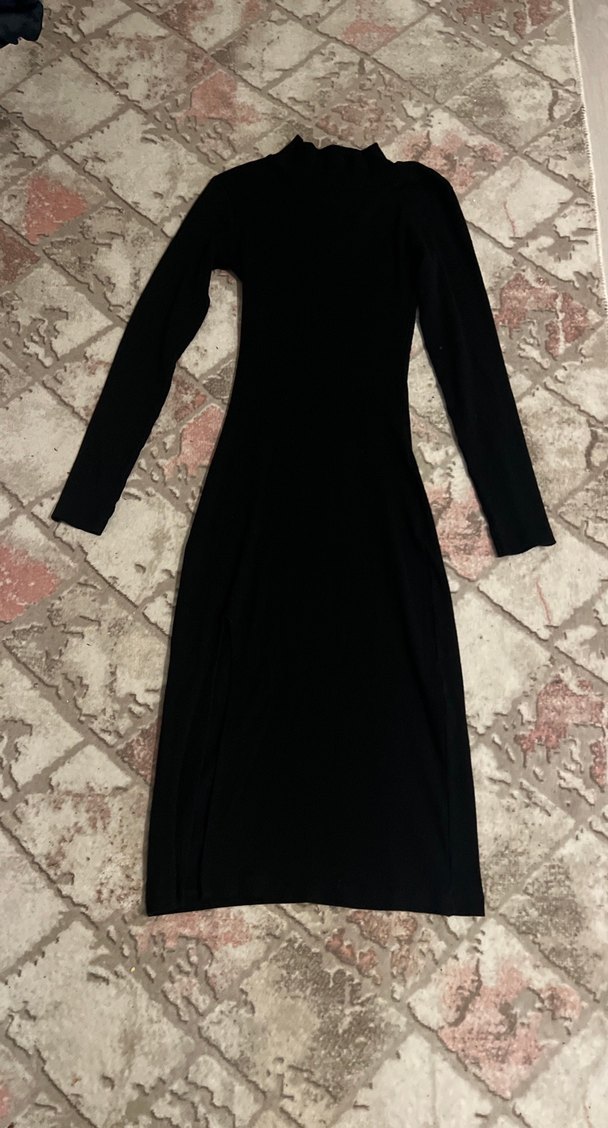 Koyu siyah renkte, uzun kollu elbise açılma payı var uzun elbise