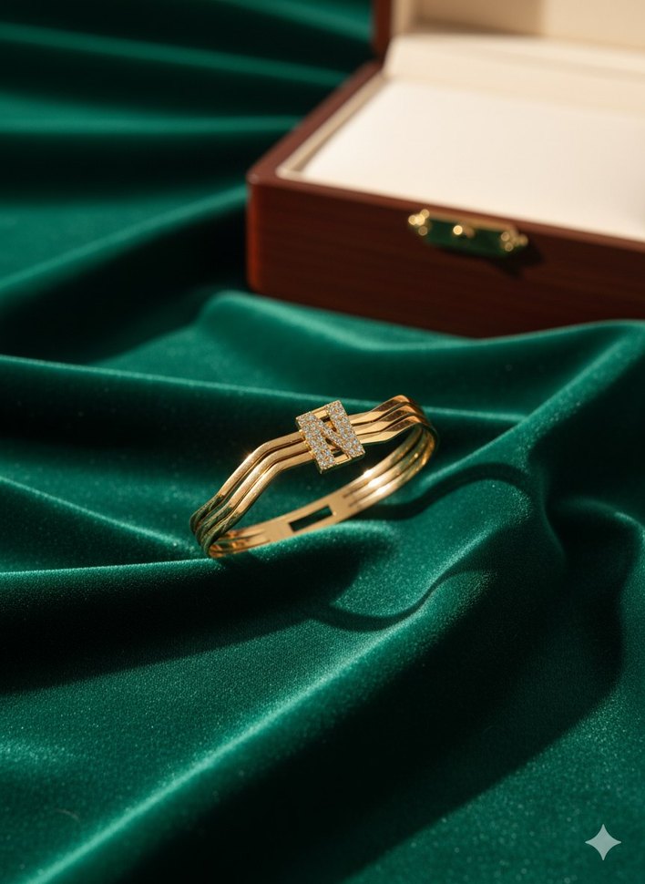 Altın renginde, kemerli ve parlak yüzeyli bileklik. Klasik ve modern şıklığı bir araya getirir, desensiz yapısıyla zarif bir görünüm sunar.