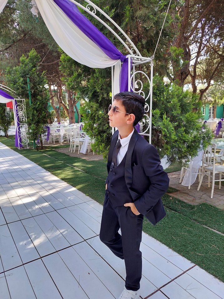 Klasik şıklıkta, notched lapel yakalı, regular fit çocuk takım elbisesi. Koyu mor renk, baskılı desen ve askılı kollarla sokak stilini yansıtıyor.