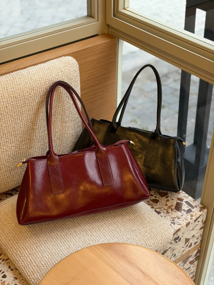 Koyu kahverengi deri kadın çanta, desen içermeyen yüzeyi ve modern klasik tarzıyla günlük kullanım için zarif ve şık bir seçenektir.