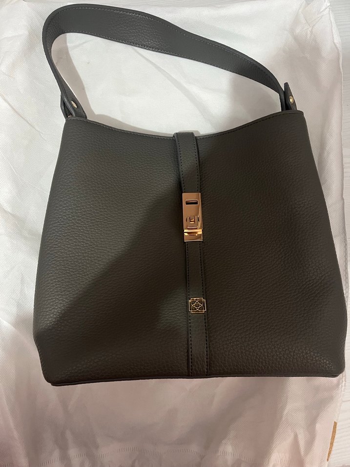 Gri deriden yapılmış, tokalı kapanışa sahip kadın çantası. Modern klasik tarzı ve iş dünyasına uygun görünümüyle günlük kullanıma uygun, desensiz şık tasarım.