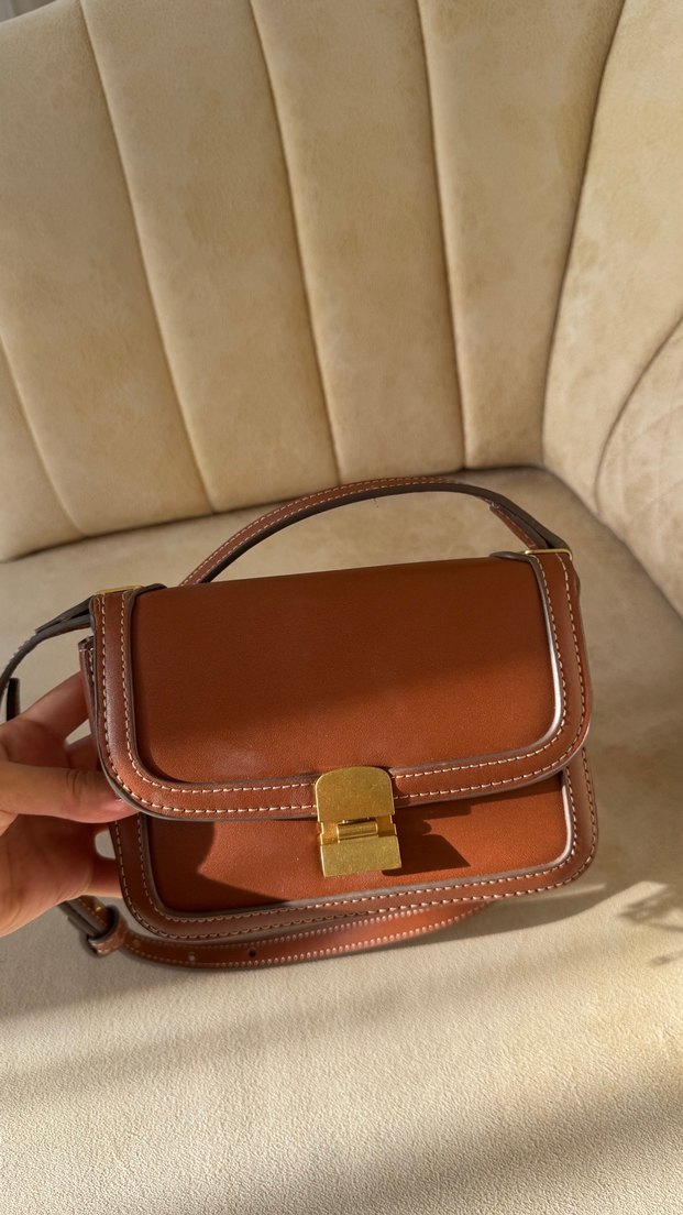 Bu modern klasik kadın çanta, parlak kahverengi deri, tokalı kapak ve temiz dikiş detaylarına sahiptir, günlük kullanım için uygundur.