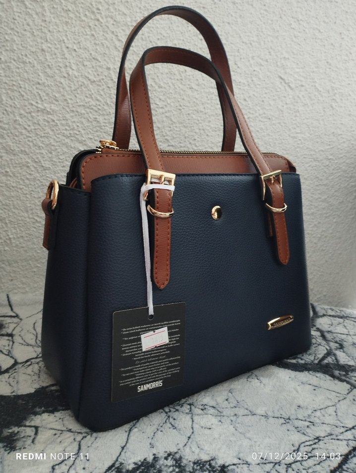 Kahverengi tokalı sapları ve baskılı dokusuyla koyu mavi deri kadın çanta, iş hayatı için çağdaş tasarıma sahip. markası sanmoris paketli sıfır çapraz çanta askısı içinde mevcuttur