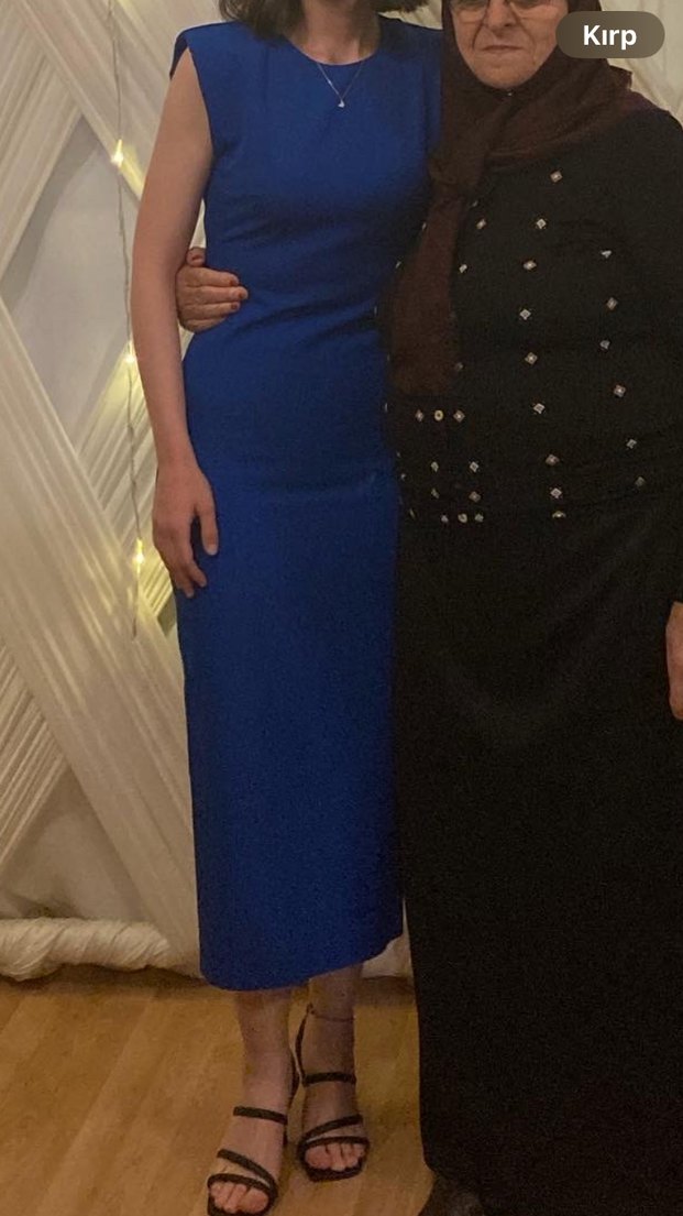 Koyu mavi renkte, uzun ve dar kesim, kolsuz abiye elbise. Yüksek yakalı ve drapeli detaylarla klasik ve şık bir görünüm sunar. 1 kez giydim nişanımda mağazadan alındı süper bir parça