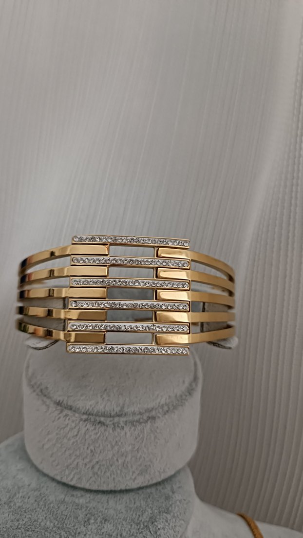 Parlak altın renginde, tokalı ve çağdaş tarzda, günlük kullanıma uygun gösterişli bir bilekliktir. ✨