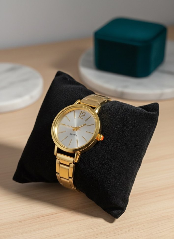 Parlak altın renkli kemer ve yuvarlak kadranıyla klasik şıklığı yansıtan çağdaş tasarımlı quartz kadın kol saati. ⌚ inst: ada__taki