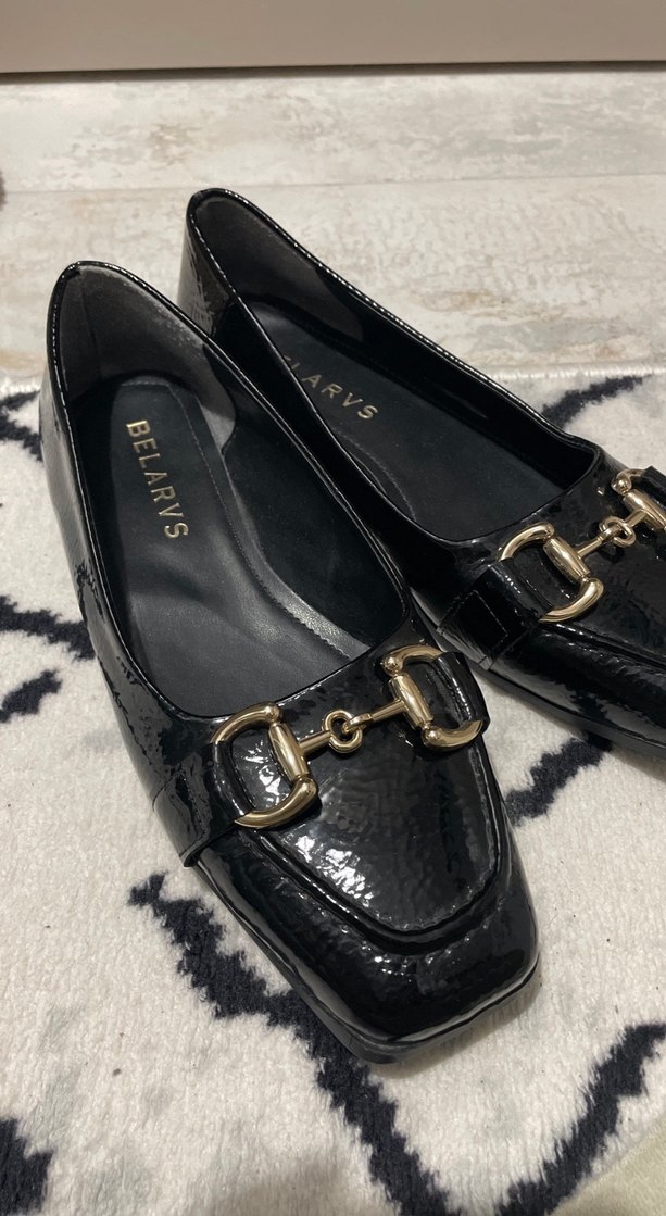 Siyah parlak yılan desenli tokalı loaferlar, blok topuk ve kauçuk taban ile klasik şıklık sunar. Marka: BELARVS.