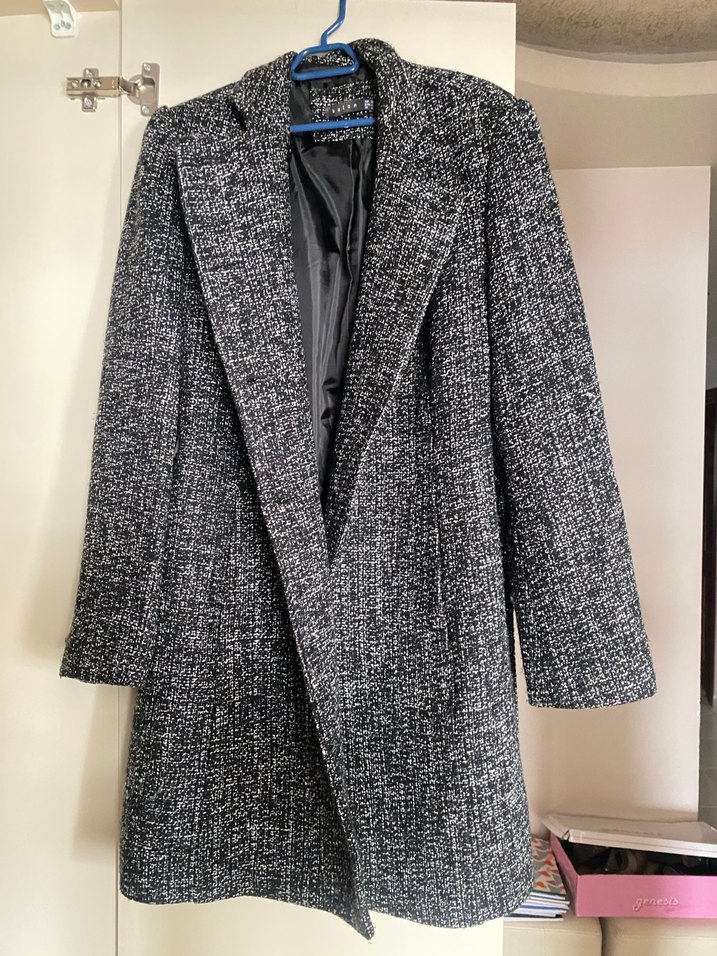 Klasik siyah-beyaz desenli, içi yumuşak astarlı, uzun kollu kadın kaban. Soğuk havalar için uygun, şık kesimle tasarlanmıştır.