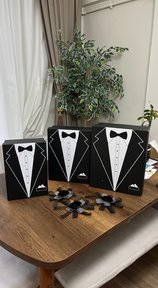 Klasik siyah damatlık desenli set, yakalı ve papyon detaylı. Düzenli kesim ve midi boy modern bir dokunuş sağlar. Düğünler için uygun.