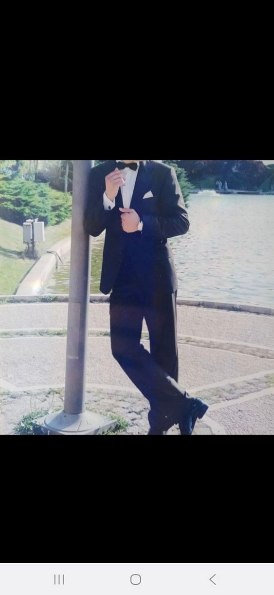 Klasik Siyah damatlık takım, notched yaka, regular fit ve strappy kollara sahip. Normal boyda ve tokalı detaylı, düğünler için uygun.