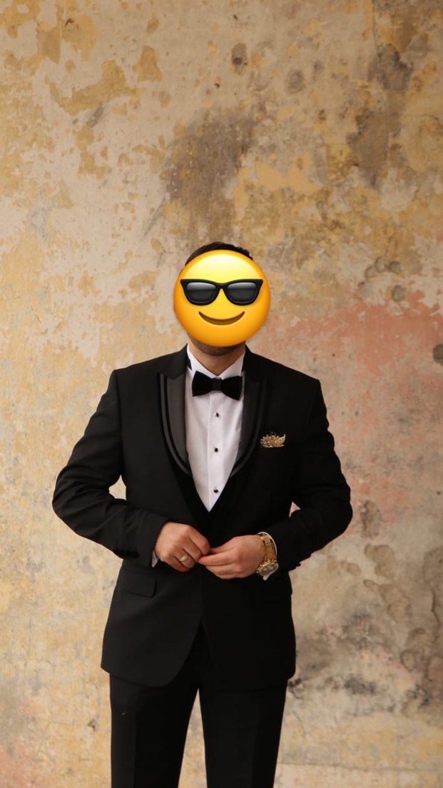 Klasik siyah damatlık takım elbise, keskin yaka ve düğmeli ön detaylı. Partiler ve resmi etkinlikler için uygundur.