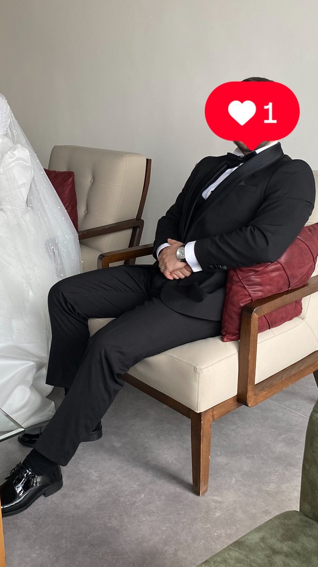 Klasik siyah damatlık takım elbise, keskin yaka ve düğmeli detaylarla düzenli kesime sahiptir. Mat saten yaka kısmı çıkarılıp normal takım elbise olarakta kullanılabilmektedir. 1.76 boy 80-82 kiloda 1 kere giyildi. 52 beden ceket, yelek, pantolon. L beden slim fit beyaz gömlek. Papyon.
