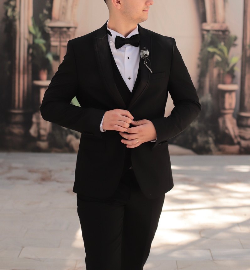 Düğünler için klasik siyah damatlık takım elbise, keskin yaka ve düğmeli ön detaylarla, rahat kesim ve askılı kollu.