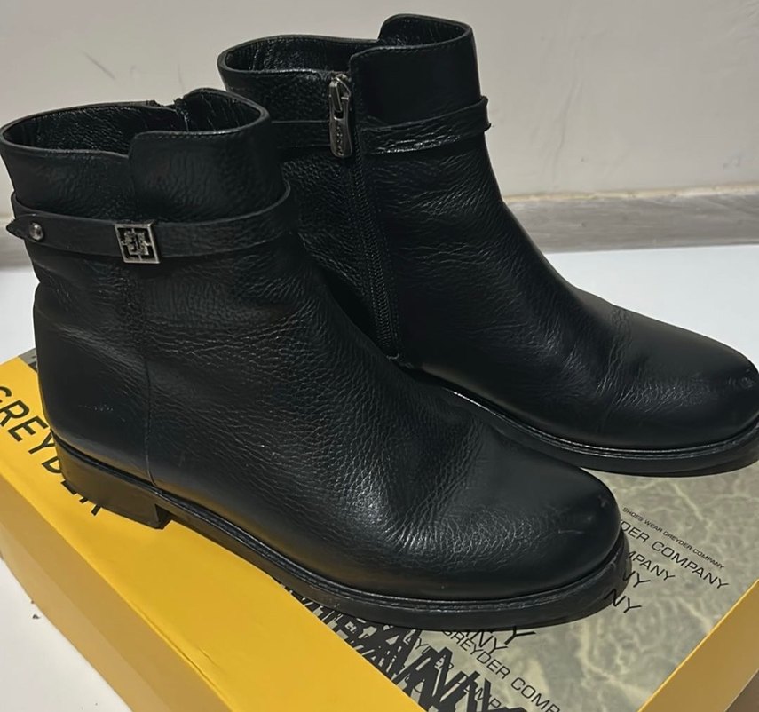 Klasik tarzda, tokalı siyah deri biker botlar. Yan fermuar ve blok topuklu, desensiz ve pürüzsüz yüzeye sahip. 3-4 defa giyildi. Araba kullanımında ufak deformasyonlar mevcuttur
