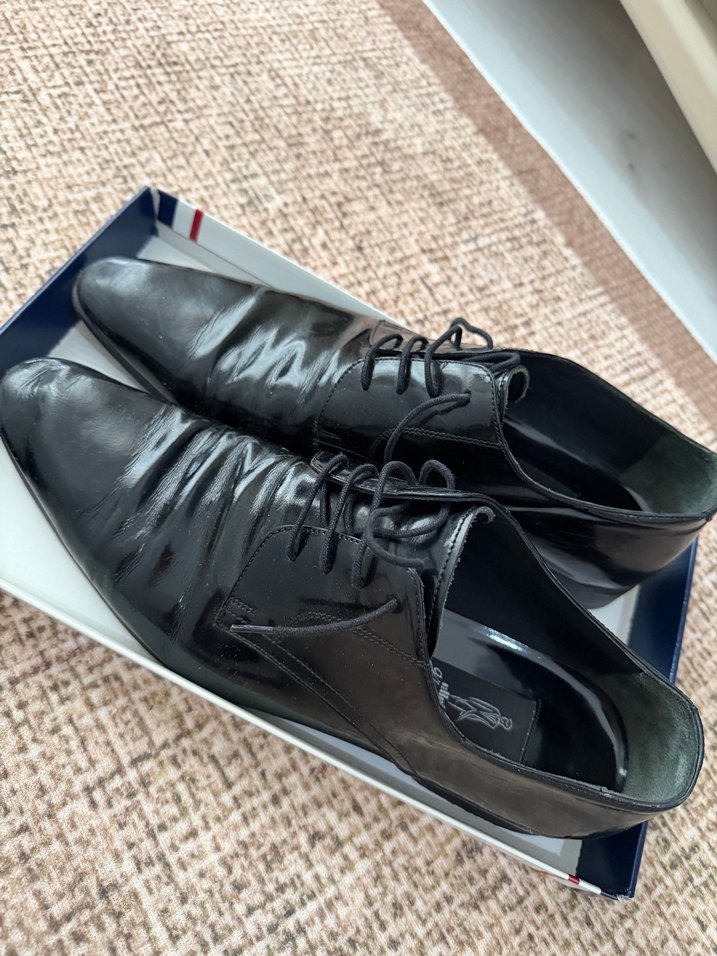 Koyu siyah renkte, pileli detaylı klasik deri erkek ayakkabısı. Ofis kullanımı için uygun, desensiz tasarım.