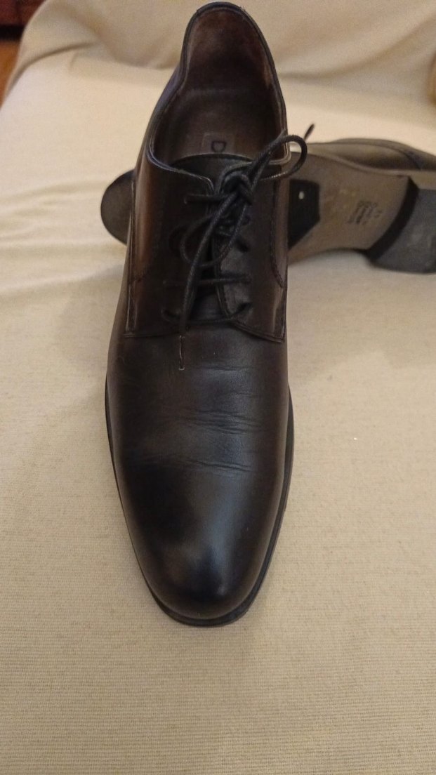 Klasik siyah deri erkek ayakkabısı, tokalı detaylı ve desensiz, ofis kullanımı için uygun, gotik tarzda.