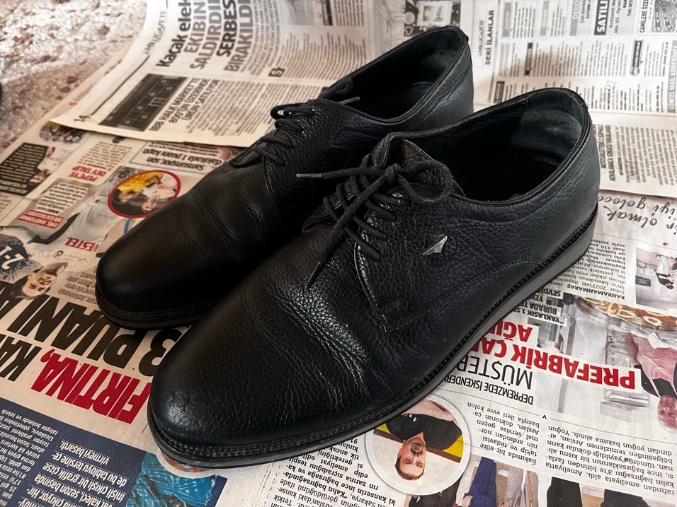 Gündelik kullanım için uygun, tokalı detaylı, desensiz siyah deri klasik erkek ayakkabısı.