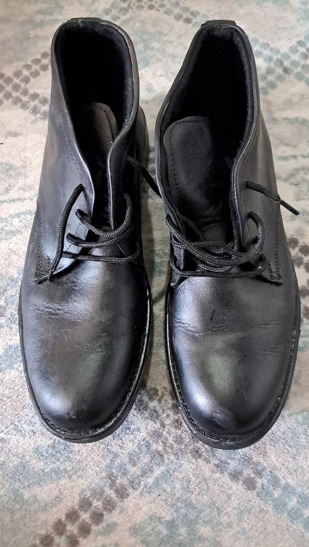 Klasik goth tarzda, tokalı siyah deri erkek botları. Düz yüzeyli, ofis kullanımı için uygun koyu renkte.