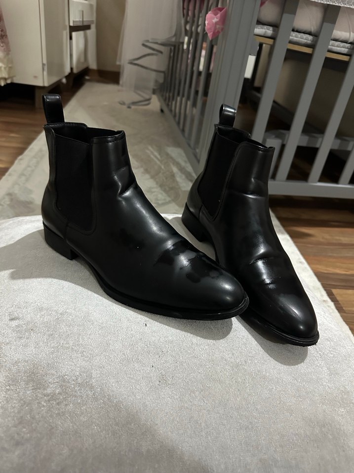 Siyah deri erkek botları, düz ve tokalı detaylara sahip. Günlük kullanıma uygun, klasik gotik tarzda.