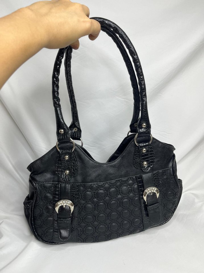 Klasik gotik tarzda, tokalı askılı, desenli siyah deri kadın çantası, günlük kullanım için uygundur. temiz sorunu yoktur