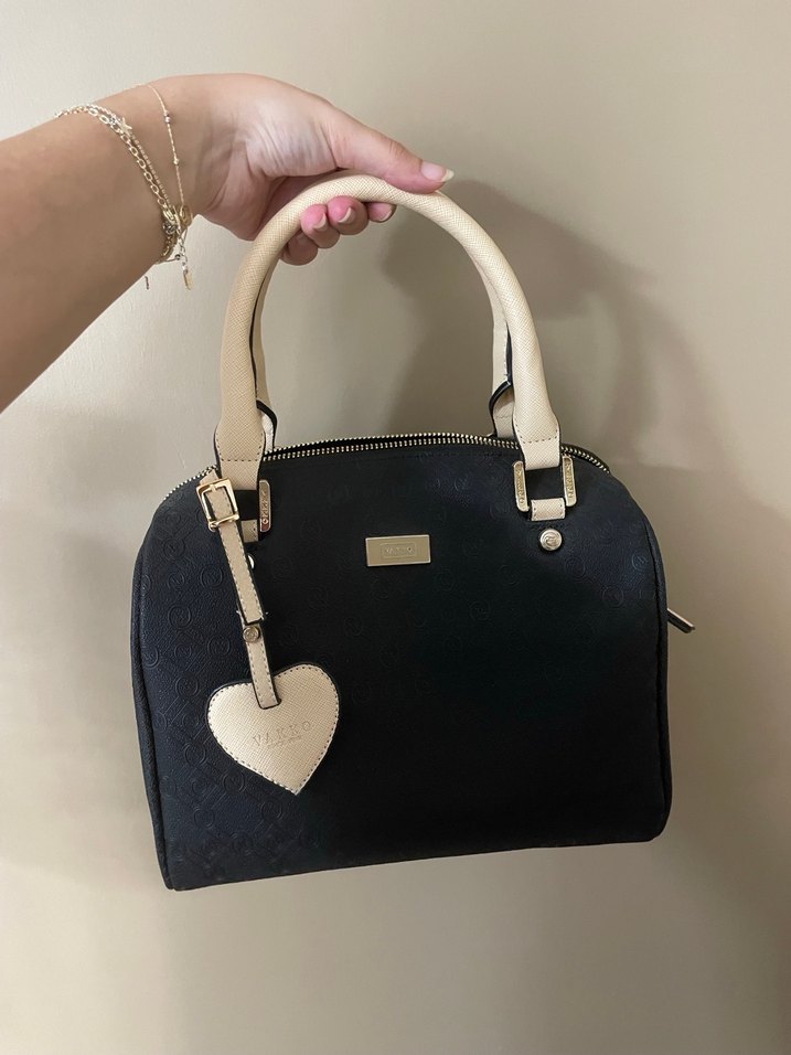 Bej saplı, kalpli aksesuar detaylı siyah deri kadın çanta, tokalı ve baskılı desene sahip. Günlük kullanıma uygun. yanında omuz askısı ile birlikte.