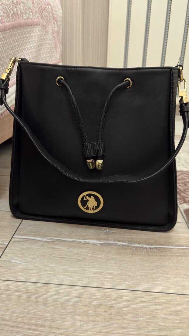 Parlak siyah deri kadın çanta, tokalı detaylı ve desenli. Modern klasik tarzda, günlük kullanıma uygun.
